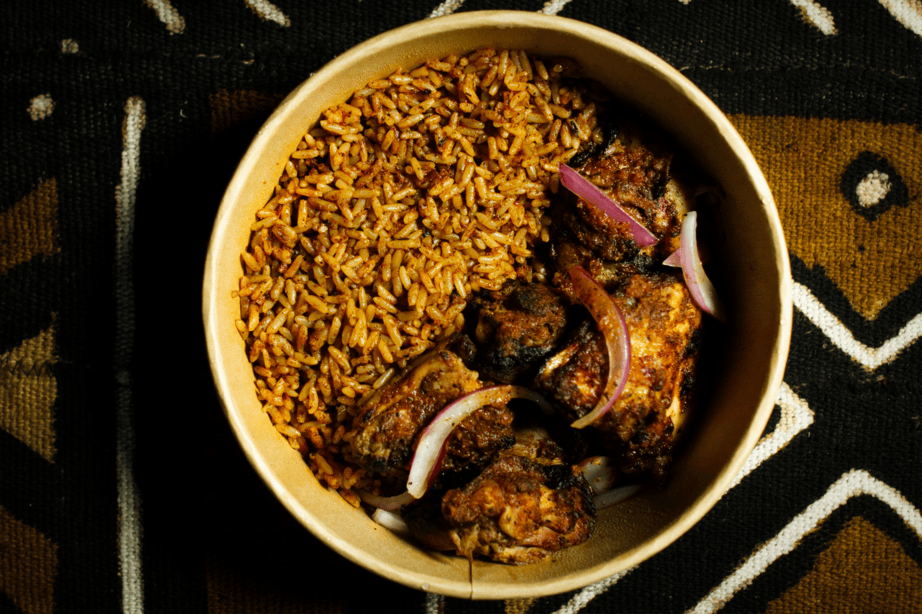 Chair Grilled chicken served with jollof rice (Poulet braisé servi avec du riz jollof)