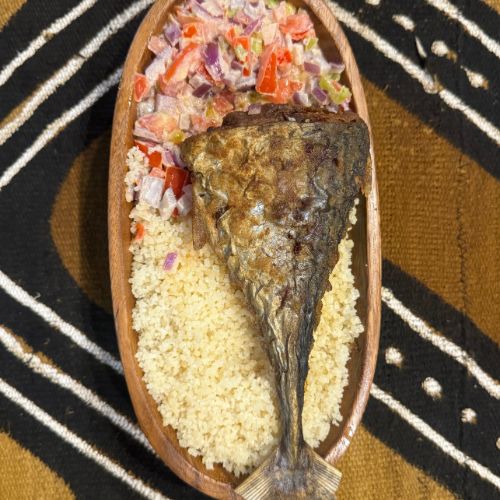 Char-grilled salmon. Served with cassava couscous. (Poisson saumon braisé servi avec attiéké).