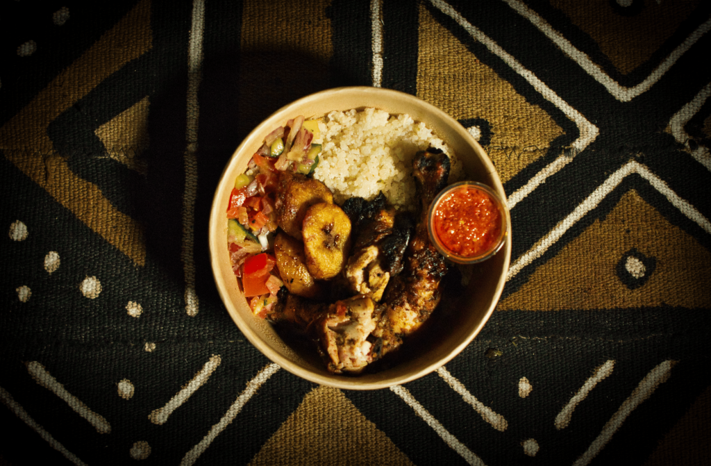 Chair Grilled chicken-cassava couscous served with a Moyo Sauce and Plantain