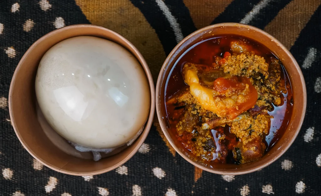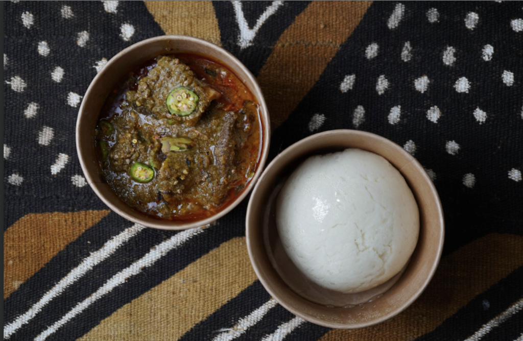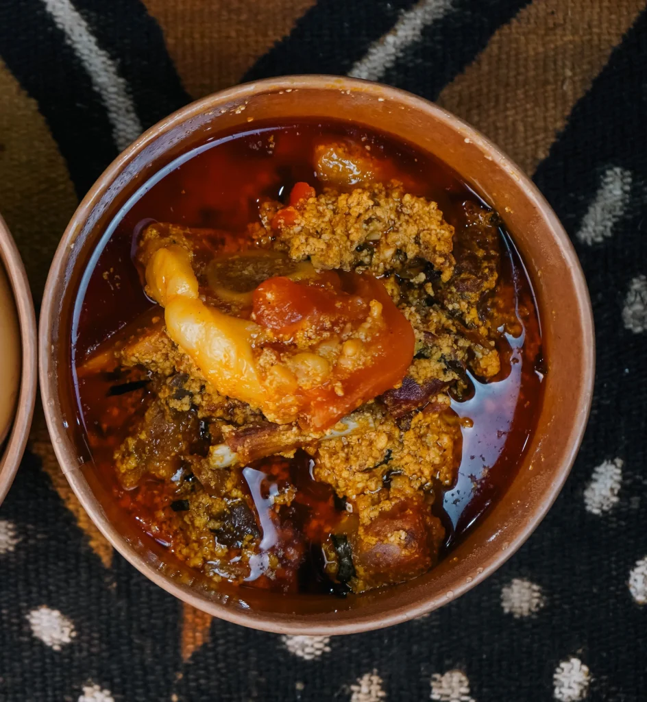 Nigerian stew of mashed & spiced melon seeds, Nganda spiced Beef tripe, Chicken and Goat served with Fufu