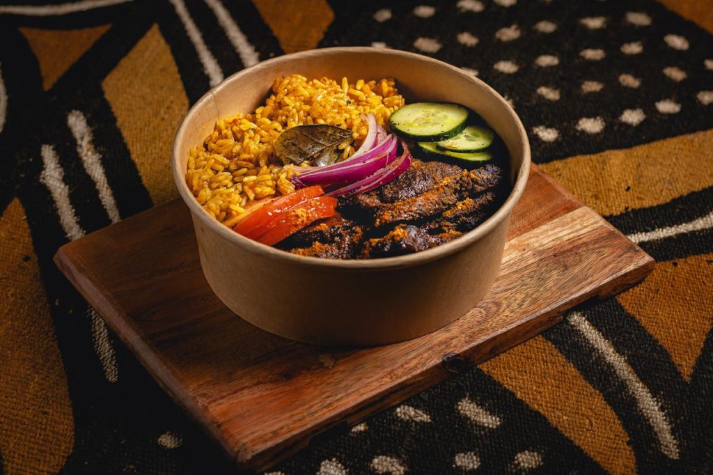 Suya dry rub spiced beef served with jollof rice (Émincé de boeuf aux épices suya servi avec du riz jollof)