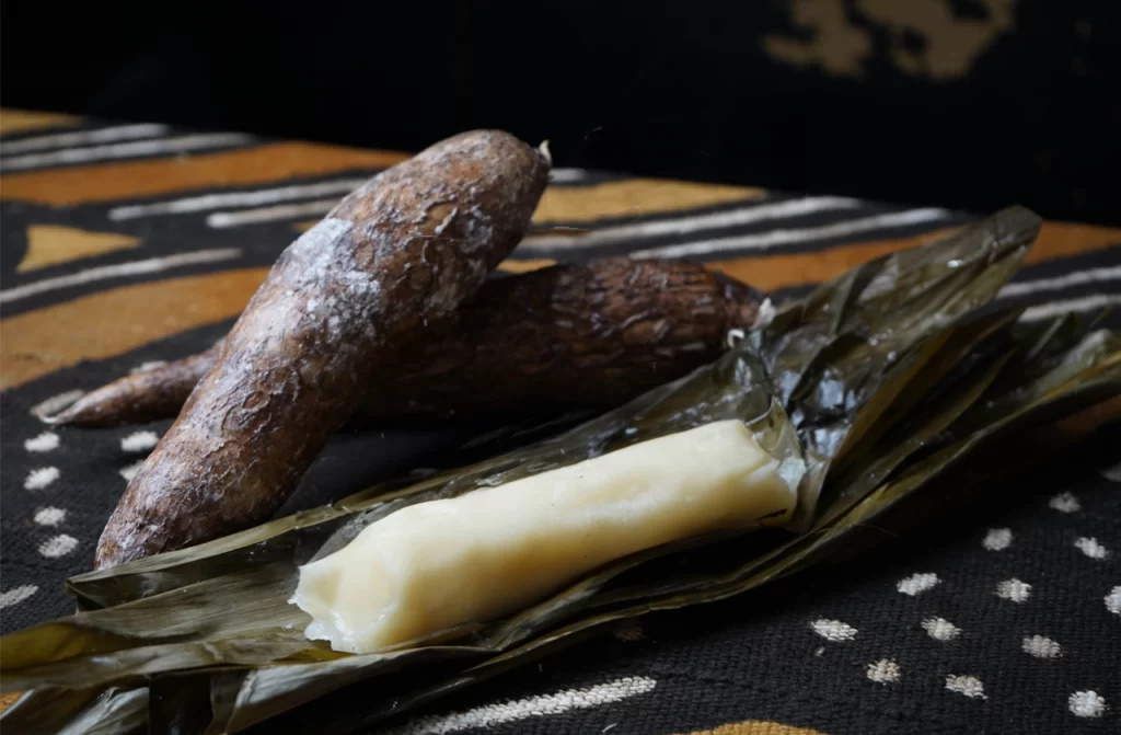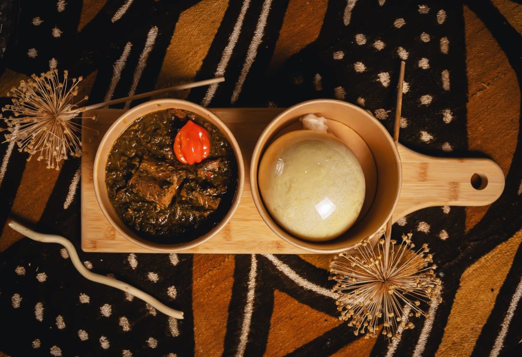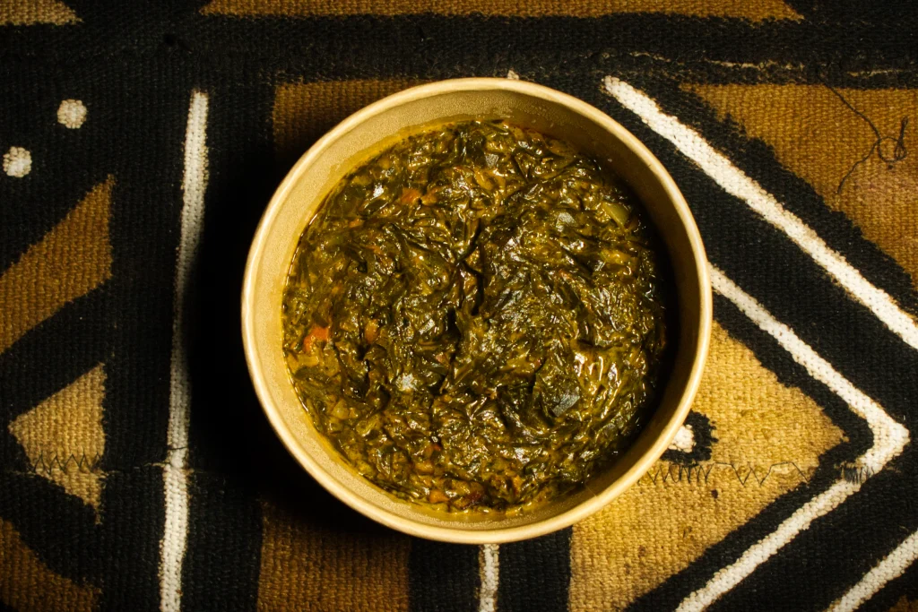 Congolese pounded cassava leaves, stewed wilh mackerel, sardine, smoked fish, eggplant, onion & palm oil served with steamed, rounded dumpling of pounded yam