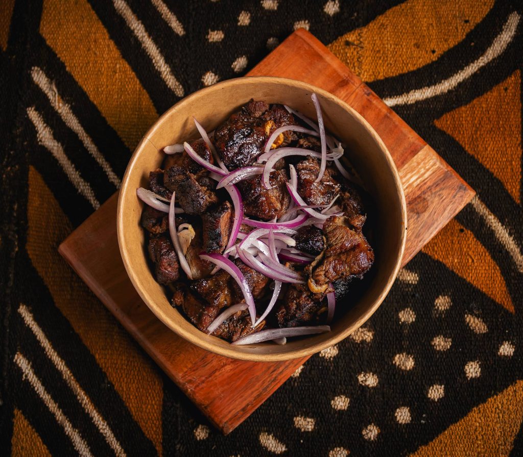 Marinated char grilled goat served with cassava steamed bread. (Chèvre braisée servi avec chikwangue).