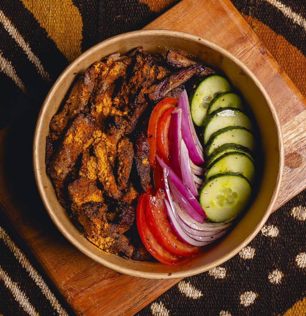 Suya dry rub spiced beef served with jollof rice. (Émincé de boeuf aux épices suya servi avec du riz jollof) or any other side.