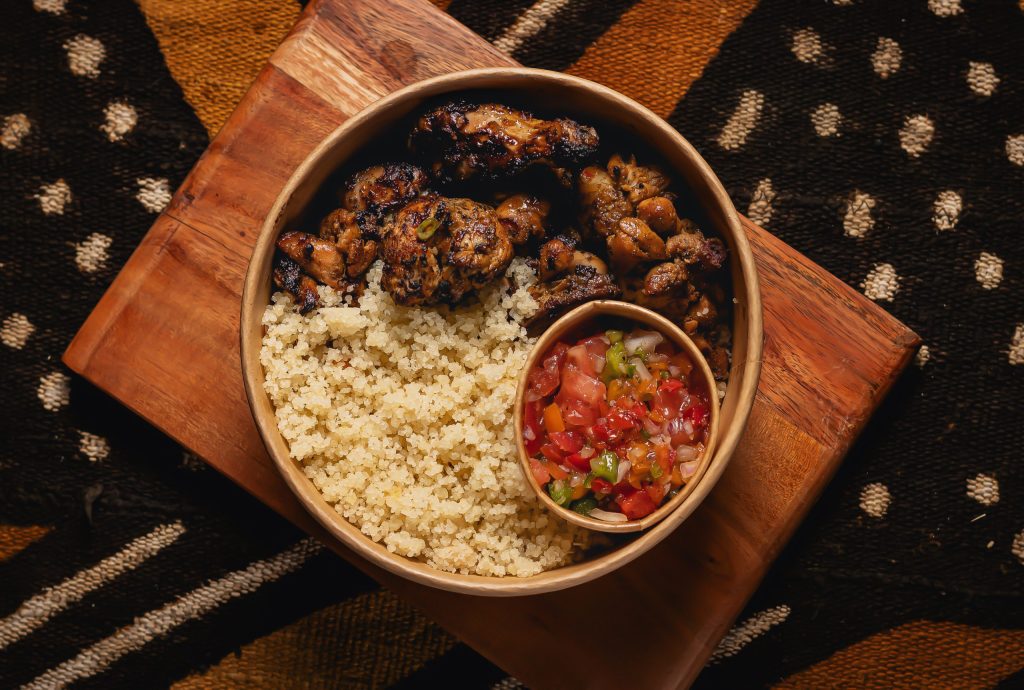 Chair Grilled chicken-cassava couscous served with a Moyo Sauce