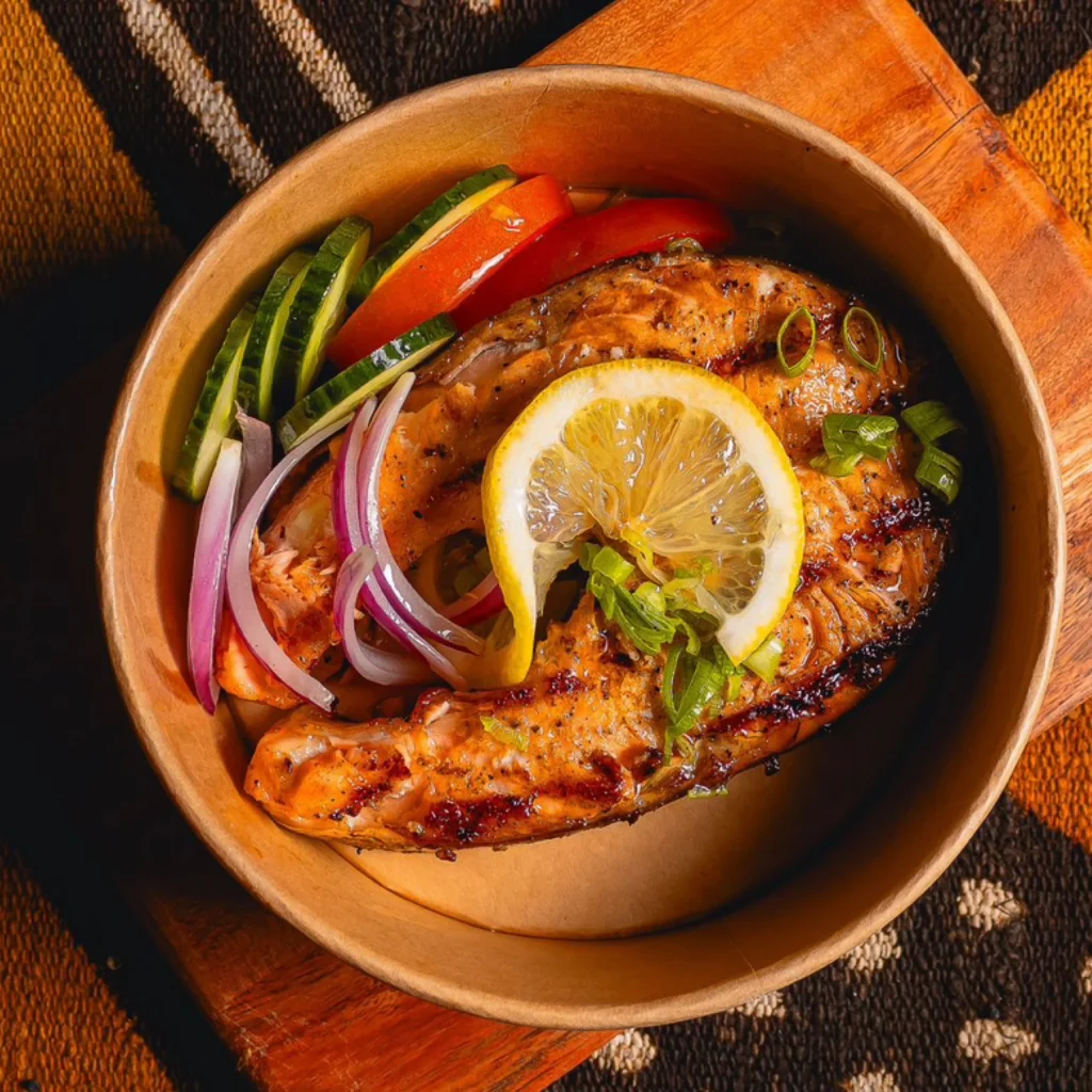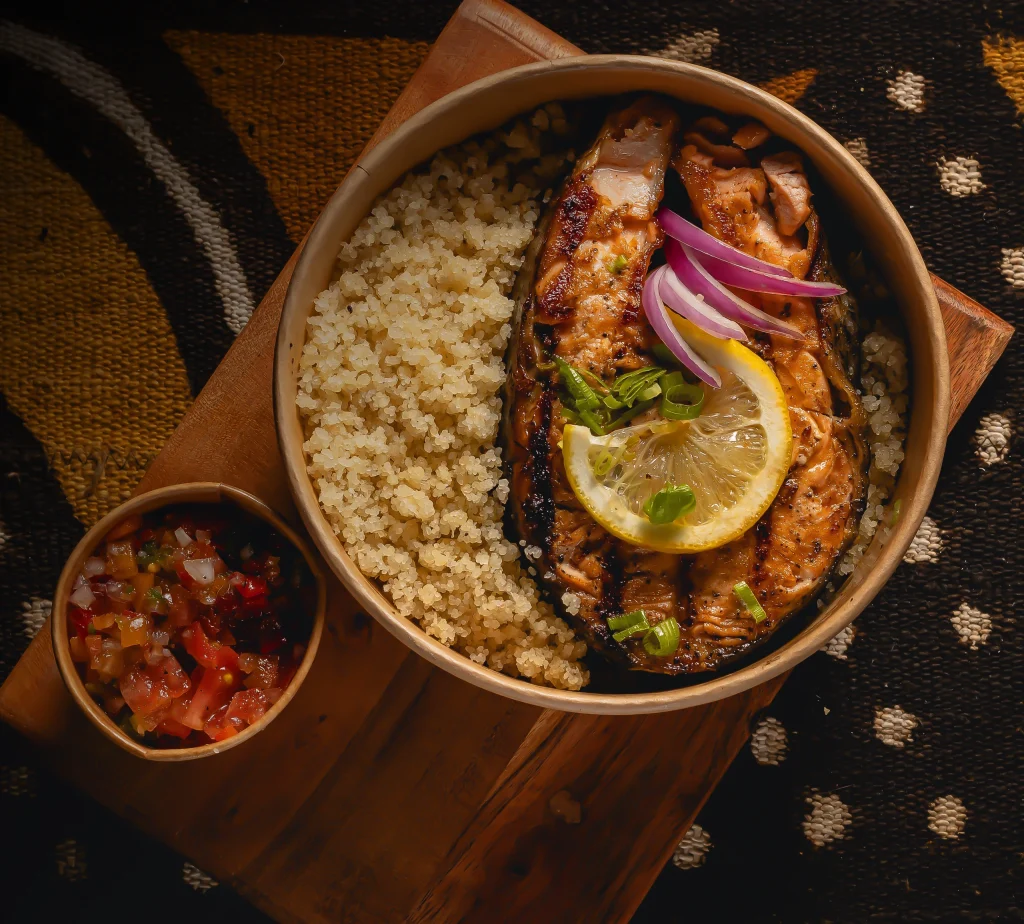 Char-grilled salmon. Served with cassava couscous. (Poisson saumon braisé servi avec attiéké).