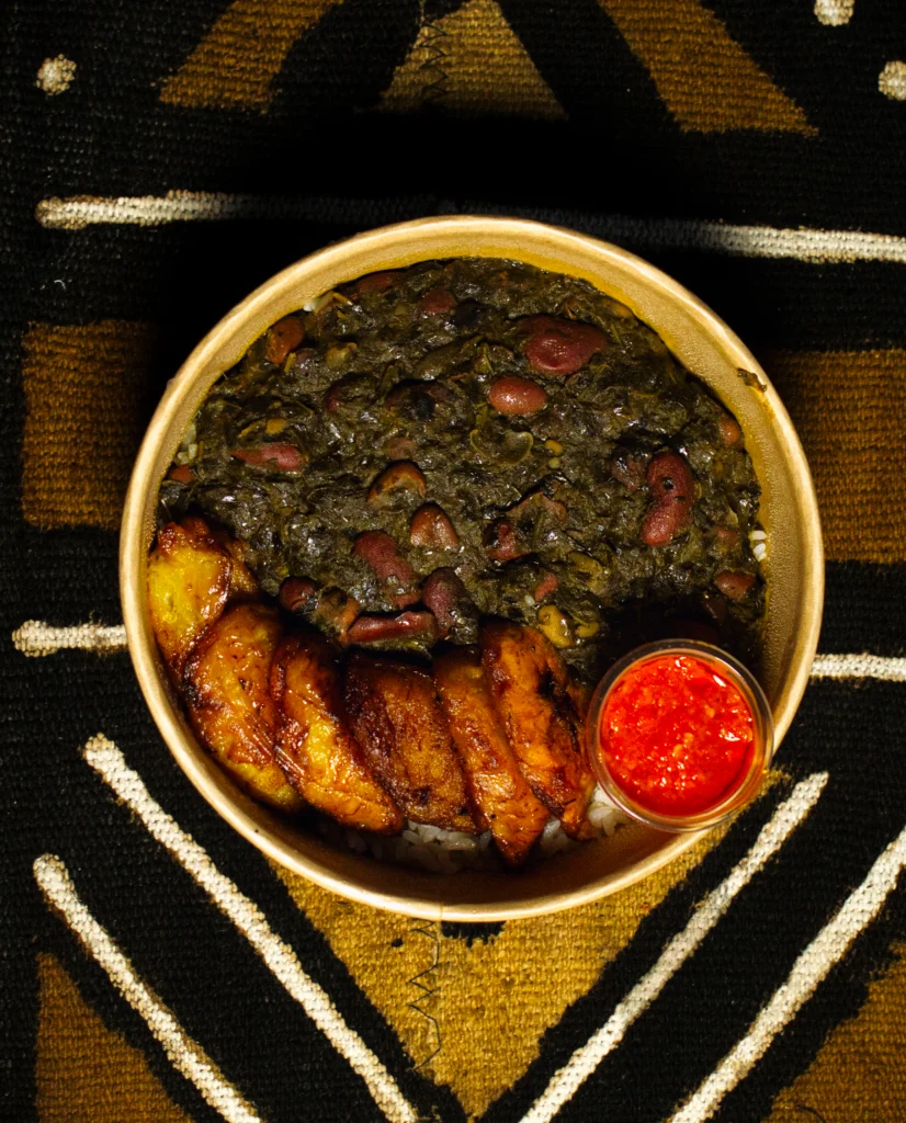 Congolese pounded cassava leaves, stewed with eggplant, onion, beans & palm oil served with white rice and plantain